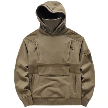 Military-inspired tactical hoodie combining modern function and rugged design. Durable cotton-blend fleece with built-in face cover and multiple zippered utility pockets for a bold, utilitarian look. Perfect for outdoor activities or urban styling.